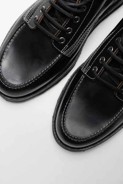 Sur le cuir lisse noir, les lacets sont ronds noirs, classiques et efficaces, pour renforcer la sobriété de la version.